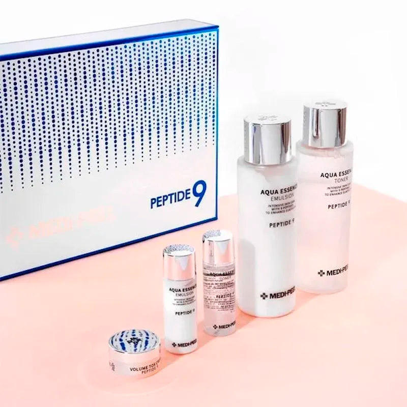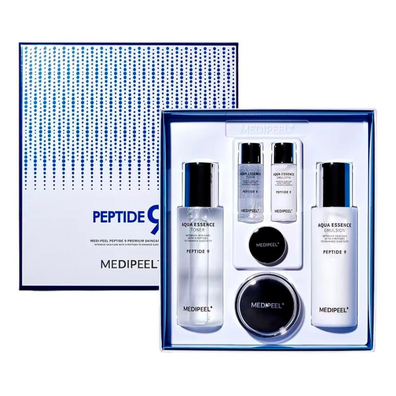 Антивозрастной набор с пептидами MEDIPEEL Peptide 9 Premium Skin Care SetНабор с пептидами для увлажнения, укрепления контура, повышения упругости кожи Medi-Peel Peptide 9 Skin Care Premium Set состоит из трёх полноразмерных уходовых продуктов и трёх миниатюр. Формулы всех уходовых средств включают в себя такие увлажняющие и омолаживающие компоненты, пептиды (9 видов), гиалуроновая кислота, аденозин, эктоин. Такой комплекс активных ингредиентов повышает скорость выработки коллагеновых и эластиновых волокон, выравнивает микротекстуру эпидермиса, усиливает кожный иммунитет. Продукты из набора глубоко увлажняют, питают, тонизируют кожу, насыщают кислородом, способствуют регенерации клеток, эффективно борются с существующими и препятствуют формированию новых заломов.