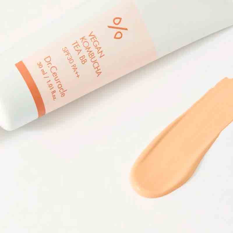Невесомый BB-крем Dr.Ceuracle Vegan kombucha tea BB SPF30 PA++ на 65% состоящий из ухаживающих компонентов словно шелковое покрытие ложится на кожу, деликатно и надежно маскируя несовершенства и выравнивая тон лица. BB-крем обеспечивает чувство увлажненности и комфорта, не скатывается и дает красивый сияющий финиш. BB-крем сохраняет чувство комфорта на протяжение всего дня, не допуская обезвоживания или раздражения кожи. При этом активные компоненты работают на улучшение тона лица, восстановление защитного барьера и замедление возрастных изменений.