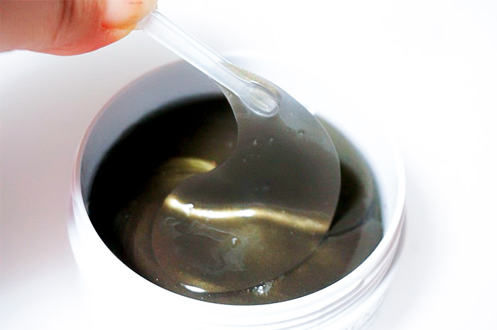 На очищенную и тонизированную кожу вокруг глаз приложить патчи острым кончиком к переносице и аккуратными похлопывающими движениями добиться их плотного прилегания.