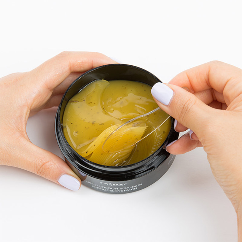 Функциональные патчи Trimay Gold Cocoon & Salmon Hydrogel Eye Patch с экстрактом кокона золотого шелкопряда и экстрактом икры лосося обладают подтягивающим действием, повышают упругость и эластичность кожи, избавляют от сухость и стянутости, а также оказывают лёгкое осветляющее действие.Эссенция, которой пропитаны патчи, содержит настоящие частицы центеллы, что делает эти патчи по-настоящему особенными. Экстракт центеллы обладает уникальными оздоравливающими и омолаживающими свойствами: улучшает микроциркуляцию,повышает эластичность и упругость кожи, способствует разглаживанию морщин, уменьшает круги и отечность под глазами.