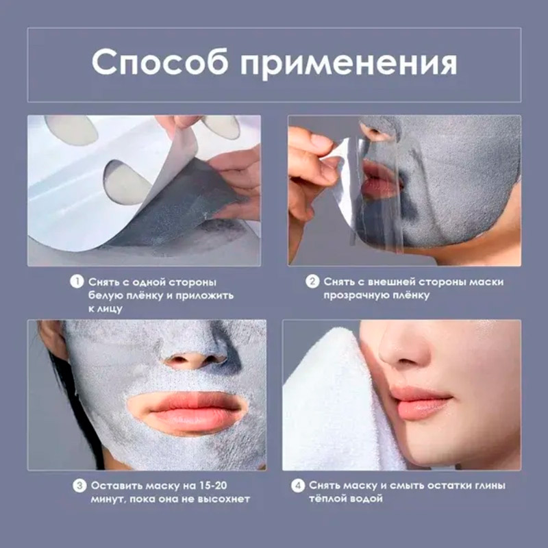 Отделите гелевую основу маски от белой защитной плёнки. Поместите обе части на лицо, разгладьте и слегка прижмите, затем удалите внешнюю защитную плёнку. Оставьте маску на 15-20 минут до полного высыхания, снимите маску и умойтесь. Продолжите уход.