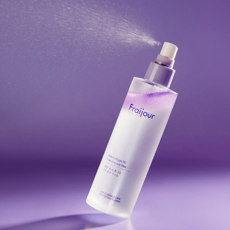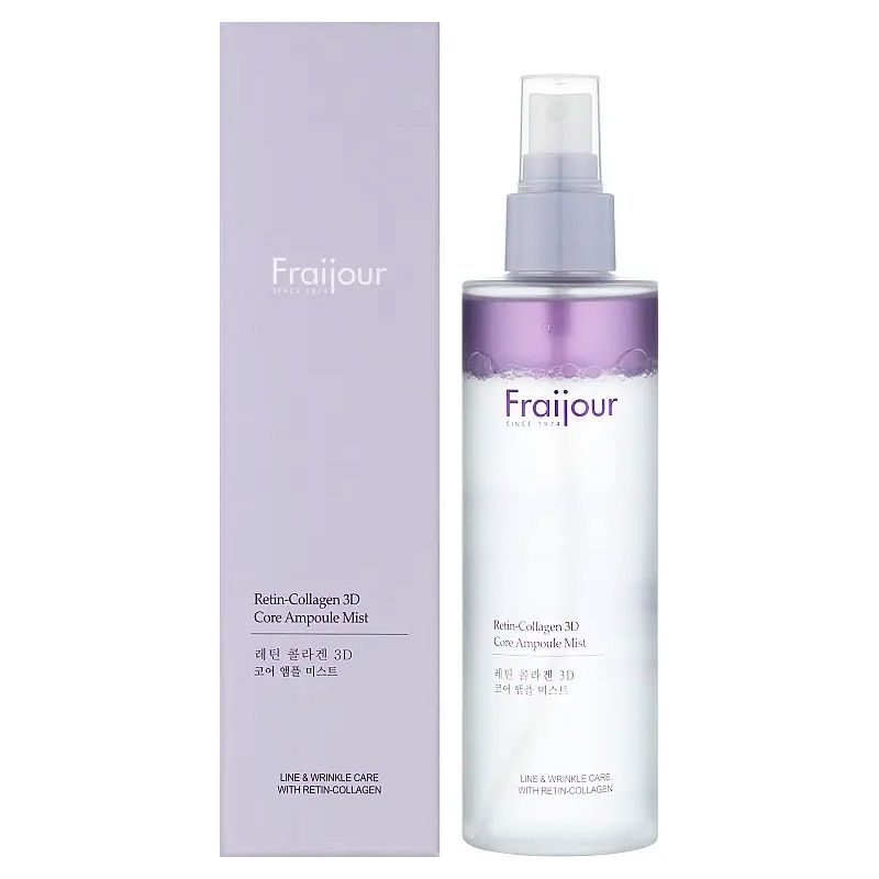 Коллагеновый ампульный мист с ретинолом и пептидами Fraijour Retin-Collagen 3D Ampoule Mist увлажняет, устраняет сухость и стянутость, стимулирует регенерацию клеток, улучшает цвет лица и дарит коже здоровое свечение. Можно использовать в качестве тонера или для дополнительного увлажнения в течение дня. Мист состоит из двух фаз — ампульной эссенции и масла, отвечающего за повышение эластичности тканей.