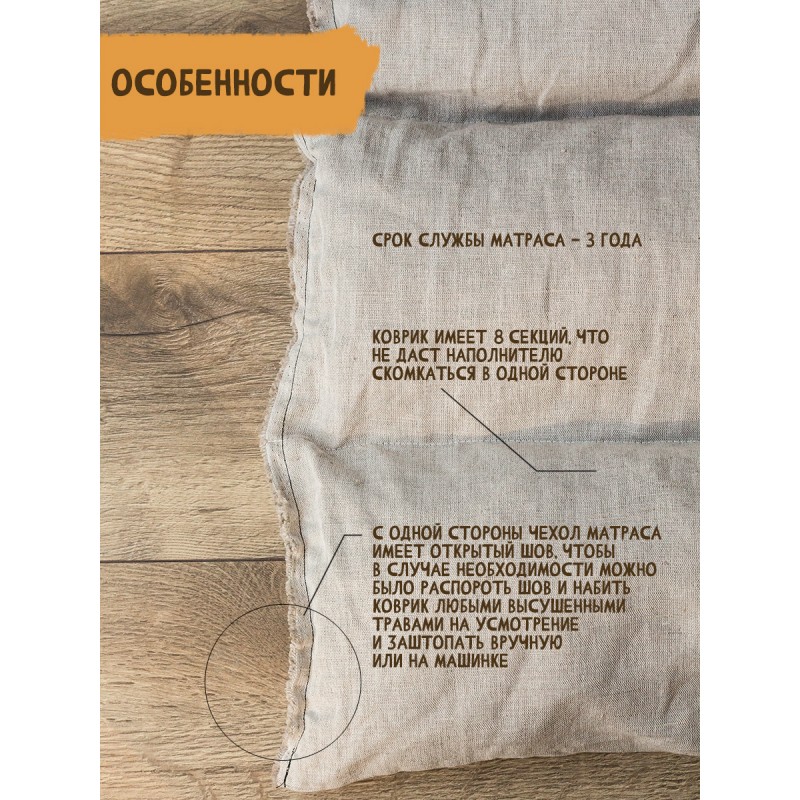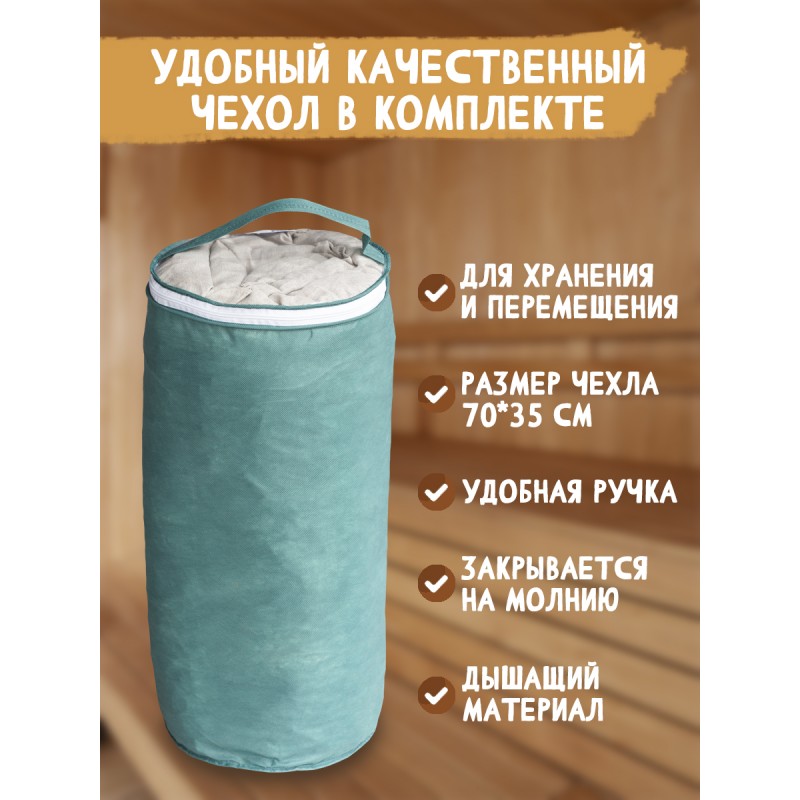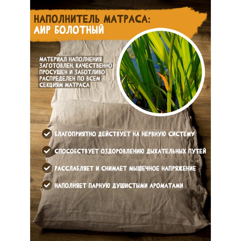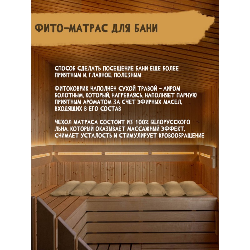 Мы придумали сделать способ посещения бани или сауны еще более приятным и главное полезным. Вашему вниманию предлагается новый банный аксессуар: фитоковрик, который предназначен для ароматизации воздуха в парной и подложки на полки в бане. Лежак для бани, или фито-матрас наполнен сухими травами, в частности используется АИР БОЛОТНЫЙ, которые нагреваясь наполняют парную приятным ароматом за счет эфирных масел входящих в их состав. Помимо всего эфирные масла обладают антибактериальными и тонизирующими свойствами, а также оказывают ингаляционный эффект. Чехол коврика для бани - это 100% льняная ткань, благодаря своей текстуре лен оказывает массажный эффект, снимает усталость и стимулирует кровообращение.
