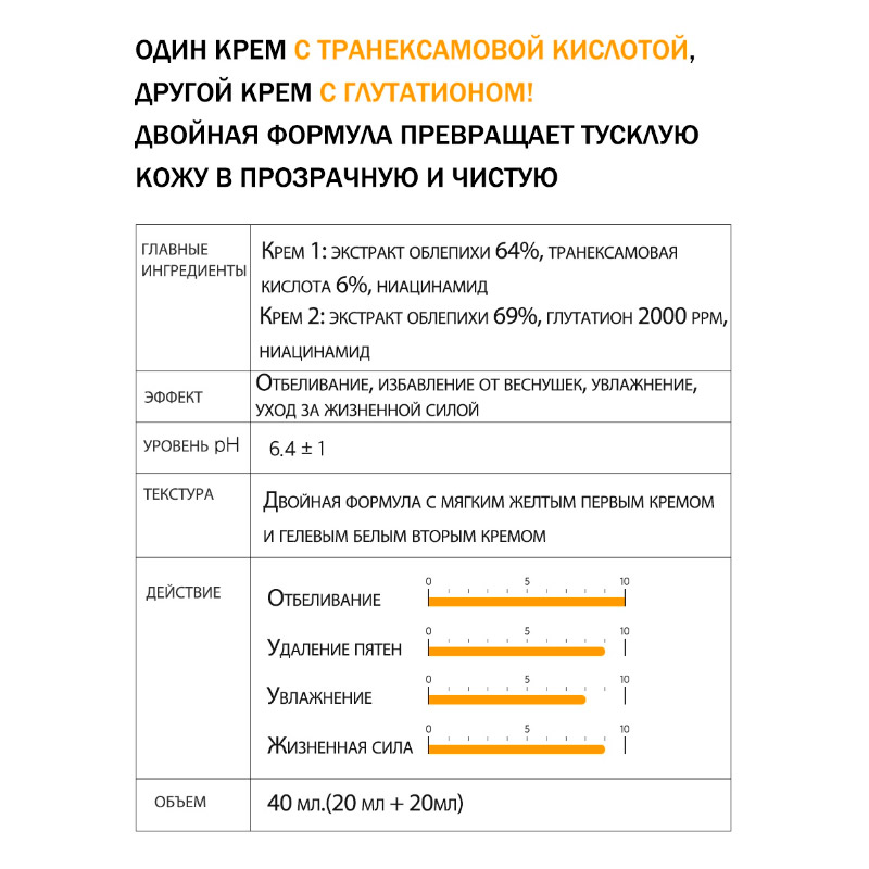 Отбеливающий крем на основе экстракта облепихи и 6% транексамовой кислоты, глубоко увлажняет, устраняет тусклость и следы усталости, осветляет нежелательную пигментацию. Замедляет процессы старения, уменьшает глубину мимических морщин и делает кожу более подтянутой. Запускает синтез коллагена и эластина, делает кожу более упругой и плотной. Крем обладает нежной текстурой, быстро впитывается и не оставляет липкой пленки.