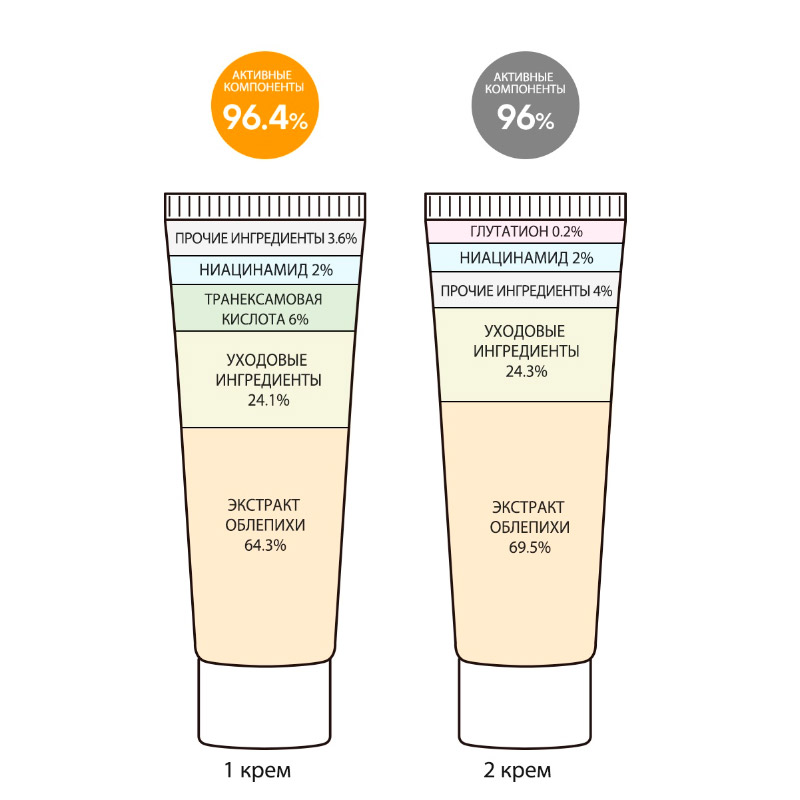 Крем №2: Hippophae Rhamnoides (Sea Buckthorn) Extract 69.5%, Dipropylene Glycol 7.0%, Glycerin 7.0%, Octyldodecanol 5.0%, Butylene Glycol 2.19%, 1.2-Hexanediol 2.16%, Niacinamide 2.0%, Caprylyl Methicone 1.0%, Glutathione (2000ppm), Cetearyl Olivate, Ammonium Acryloyldimethyl Taurate / Vp copolymer, Polyglyceryl-10 Behenate/ Eicosadioat, Polymethylsilsesquioxane, Hydroxyethyl Acrylate/Sodium Acryloyldimethyl Taurate Copolymer, Sorbitan Oliveate, Arginine, Acrylate/C10-30 Alkyl Acrylate Crosspolymer, Ethylhexylglycerin, Xanthan Gum, Sorbitan Isostearate, T-Butyl Alcohol, Disodium EDIT, Purified water, Perfume.