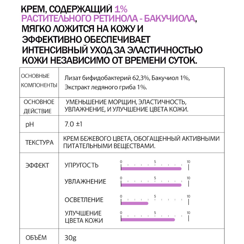 Насыщенный крем с содержанием 1% бакучиола и 62% лизата бифидобактерий уменьшает пигментацию, борется с акне, повышает упругость кожи и эффективно борется с морщинами за счёт растительного ретинола. Формула сбалансирована увлажняющими и питательными ингредиентами. Подходит для нанесения в дневное время, а также идеален для чувствительной кожи.