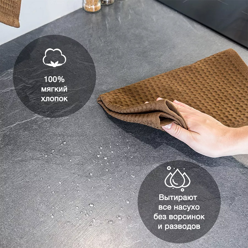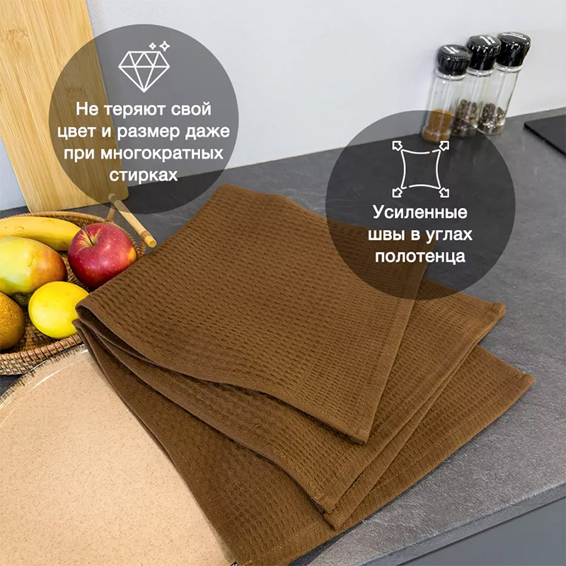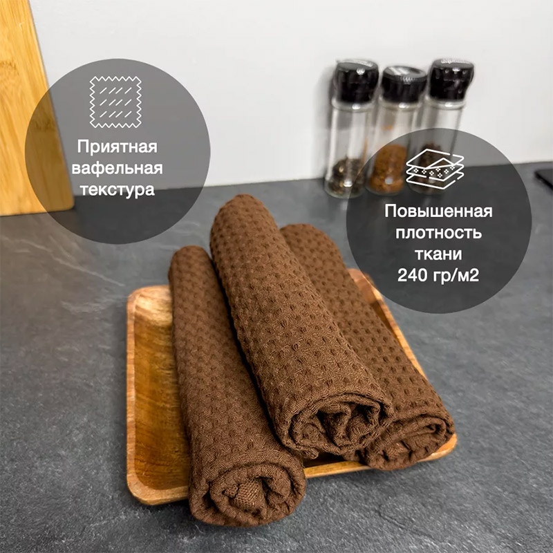 Великолепные вафельные полотенца, представленные в нашем наборе из трех штук, станут настоящим украшением вашей кухни. Коричневый оттенок придаст интерьеру свежесть и элегантность, идеально впишется в различные стили - от современного и лофта до классики и прованса.