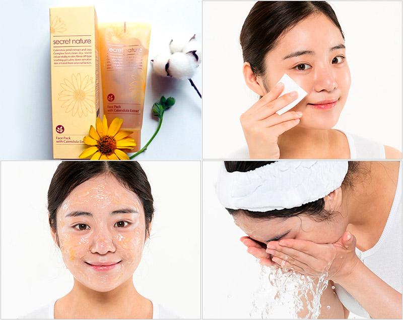 Смягчающая маска для лица Secret Nature Face Pack With Calendula Extract, успокаивающая кожу, оказывающая противовоспалительное и ранозаживляющее действие. Маска действует эффективно, мгновенно устраняя покраснения на коже, ее неровный тон, различные несовершенства. Маска устраняет раздражения, наполняя ее влагой, делая упругой и эластичной. Средство прекрасно подойдет для раздраженной, проблемной и комбинированной кожи. Нежная гелевая текстура маски проникает в глубокие слои кожи, успокаивая ее и даря ощущение легкости и комфорта.