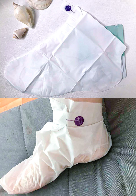 На чистые, сухие ноги надеть носочки, закрепить стикером. Оставить на 10-20 мин, оставшуюся эссенцию распределить по коже массажными движениями.