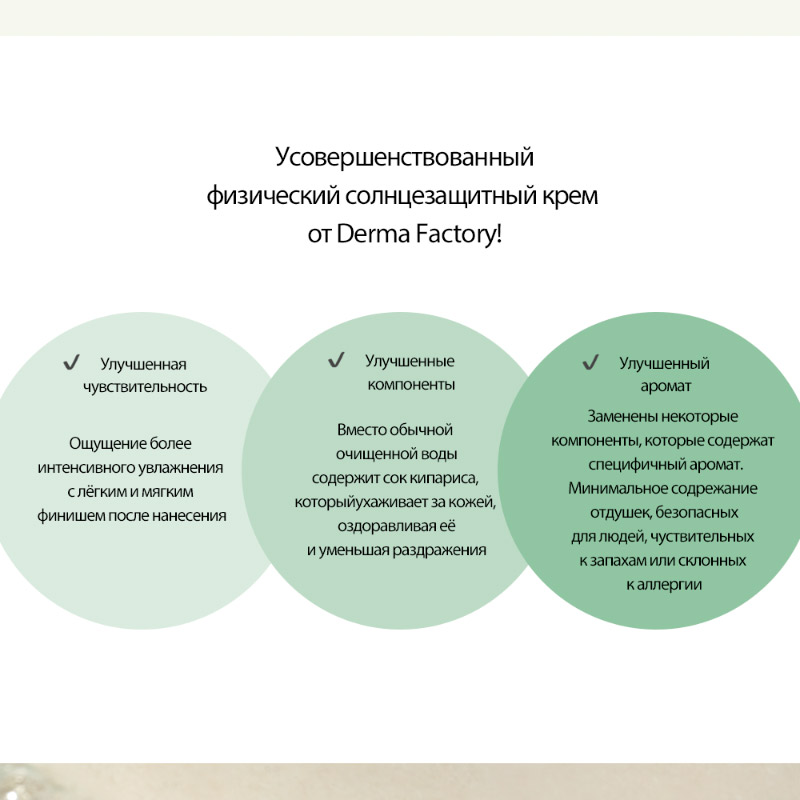 Мягкий солнцезащитный крем Derma Factory Mild sun cream SPF 50+ PA++++ на основе неорганических ингредиентов, содержащий 41% воды из листьев полыни, поддерживает здоровье чувствительной кожи и защищает ее от вредного воздействия внешней среды. Крем увлажняет и успокаивает кожу, оказывает бактерицидное, антисептическое, противовоспалительное действие. Нормализует гидро-липидный баланс кожи.