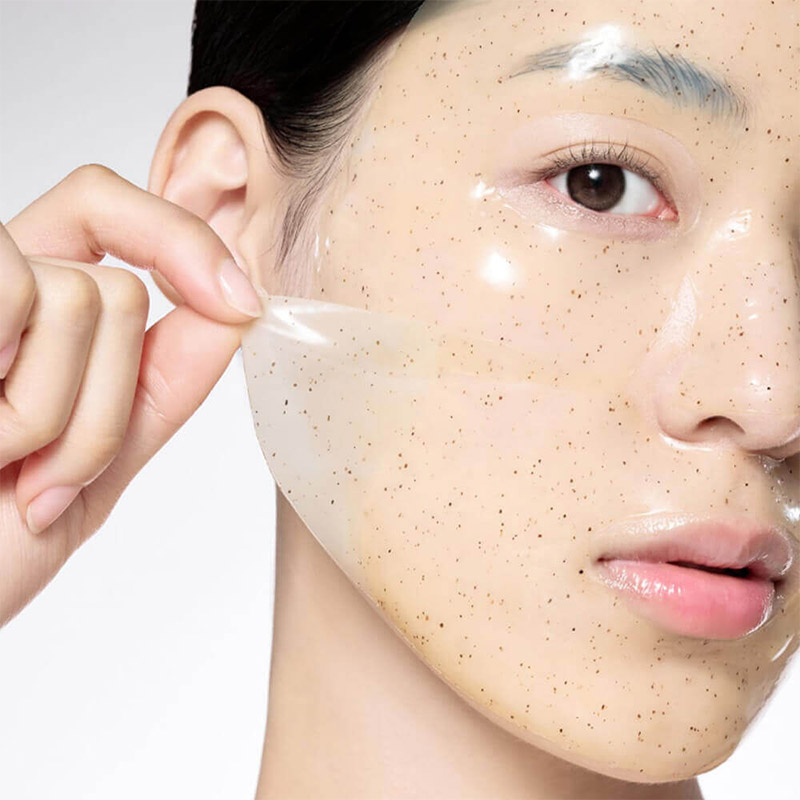 Протрите кожу пилинг-спонжем, затем отделите гидрогелевую основу маски от защитной плёнки. Поместите все части на лицо, разгладьте и слегка прижмите. Оставьте маску на 20−30 минут, пока она не станет прозрачной. Снимите маску, не смывайте остатки эссенции, продолжайте уход.
