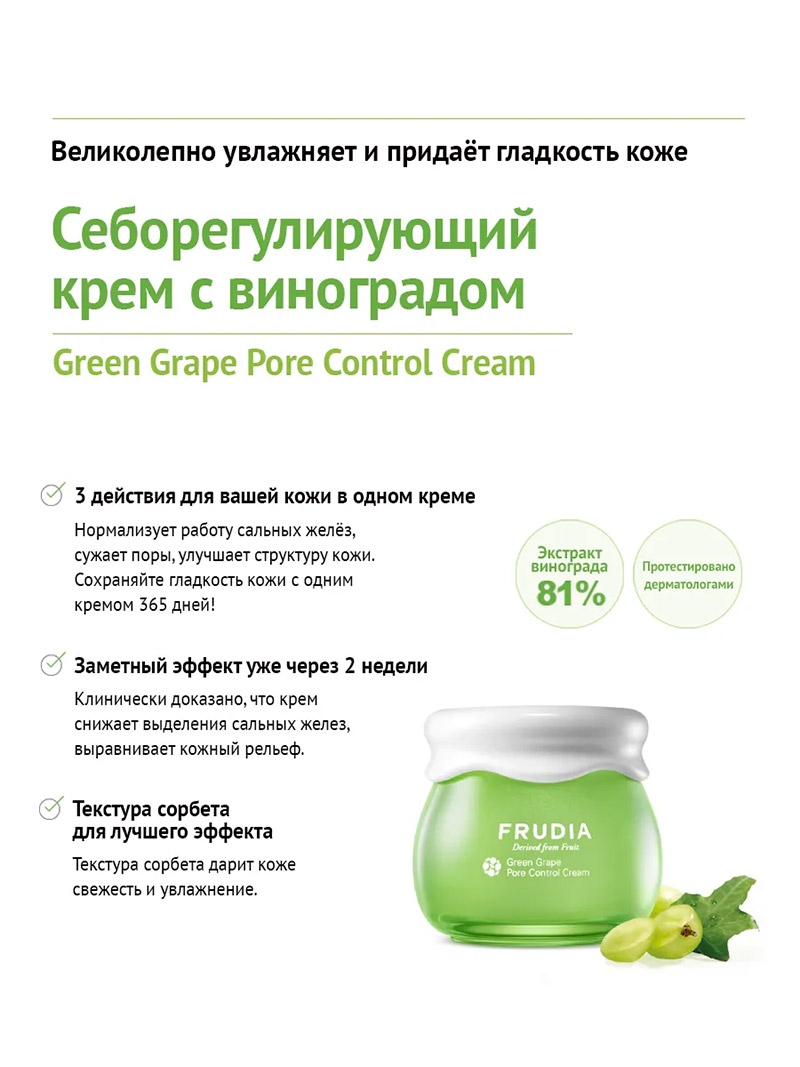 Себорегулирующий крем для лица, в основе которого вместо воды используется вытяжка из зелёного винограда, идеально подходит для жирной и комбинированной кожи. Действие средства направлено на устранение повышенной секреции себума, предотвращает возникновение закупорок, предупреждает развитие воспалительных процессов.