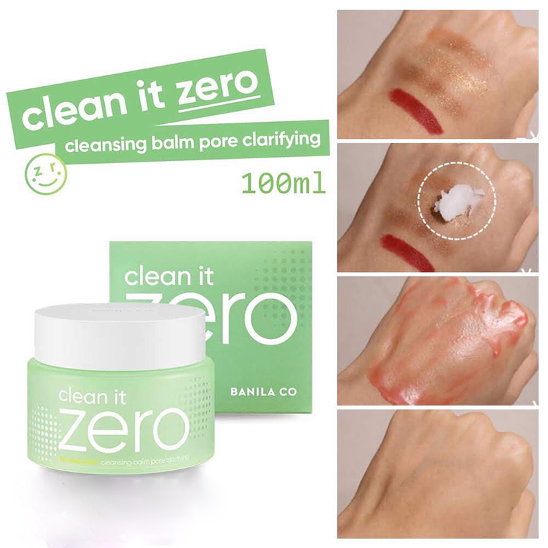 Твердый бальзам Banila co Clean It Zero Cleansing Balm Pore Clarifying для снятия макияжа превращается в мягкий щербет при контакте с кожей – быстро растворяет косметику, адсорбирует/удаляет грязь, излишки себума, выравнивает цвет/микрорельеф лица, подходит для всех типов кожи.