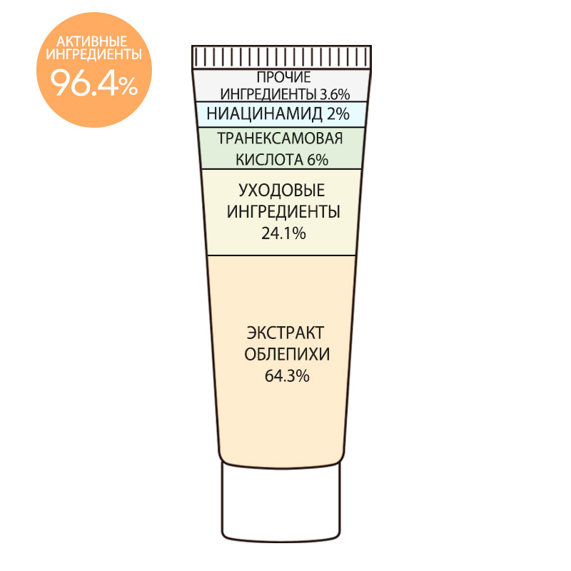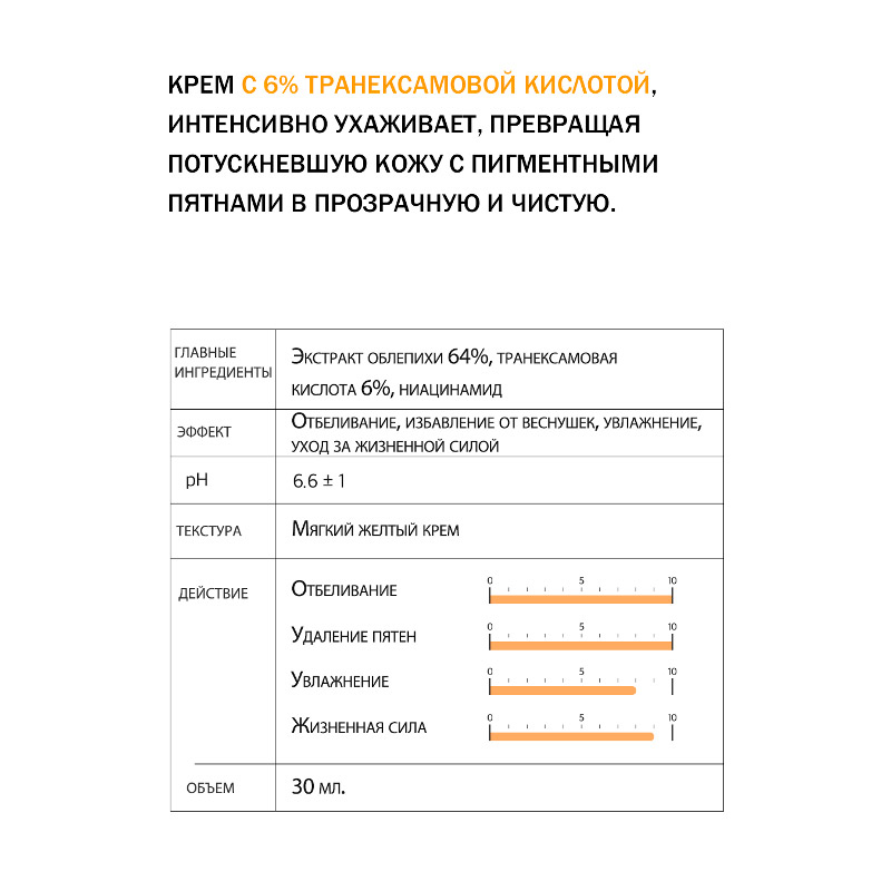 Отбеливающий крем на основе экстракта облепихи и 6% транексамовой кислоты, глубоко увлажняет, устраняет тусклость и следы усталости, осветляет нежелательную пигментацию. Замедляет процессы старения, уменьшает глубину мимических морщин и делает кожу более подтянутой. Запускает синтез коллагена и эластина, делает кожу более упругой и плотной.