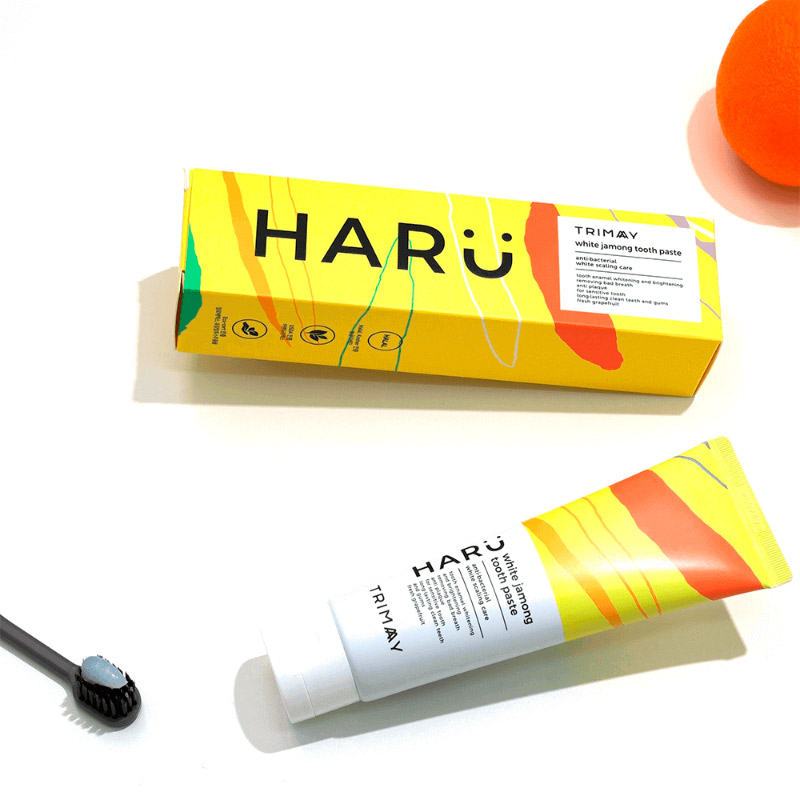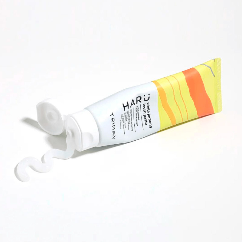 Зубная паста с ароматом грейпфрута и мяты Trimay HARU Biometic Tooth Paste отбеливает за счет натурального и безопасного ингредиента — 35% перекиси водорода, которая деликатно удаляет налет, не повреждая зубную эмаль, и нейтрализует вредные бактерии.