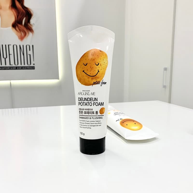- Around me Potato Foam. Пенка для умывания с экстрактом картофельного крахмала Картофельный крахмал обладает осветляющим эффектом, возвращает коже упругость, эластичность, устраняет все признаки увядания. Успокаивает раздраженную кожу, делает ее сияющей и здоровой. Защищает от солнечный лучей и других негативных воздействий окружающей среды. Воздушная пена эффективно очищает кожу лица без раздражений. После умывания поддерживает ph баланс, не стягивает кожу.