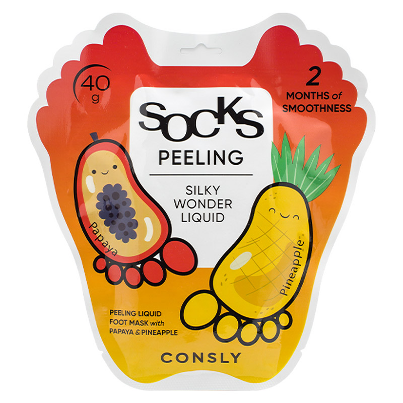 Отшелушивающие пилинг-носочки для ног с экстрактами папайи и ананаса Consly Silky Wonder Papaya and Pineapple Peeling Liquid Foot Mask - это экспресс-средство для педикюра в домашних условиях. Специальный пилинг-раствор, налитый в носочки, при контакте с кожей, растворяет ее ороговевшие слои, создавая эффект пилинга, и предназначен для отшелушивания старой огрубевшей кожи, в том числе в труднодоступных местах, в складках и на пальцах ног. С этим средством вы забудете о боли и усталости в ногах. Регулярное использование таких носочков обеспечивает необыкновенно гладкие пятки, избавляет от мозолей, кутикулы, натоптышей и шероховатостей на долгое время.