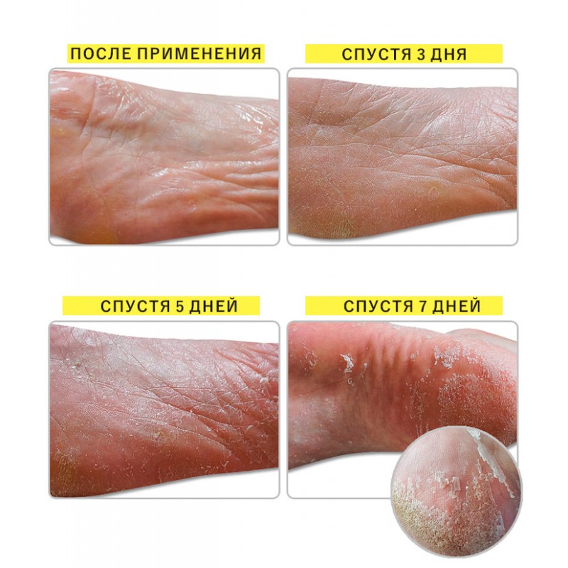 Действие пилинг-носочков направлено на отшелушивание омертвевших клеток эпидермиса и интенсивное питание кожи. Кроме того, пилинг-носочки оказывают антибактериальный и противомикробный эффект, ускоряет регенерацию и восстановление целостности кожных покровов. Носочки изнутри пропитаны активной концентрированной эссенцией на основе кислот, продукт прост и лёгок в применении.