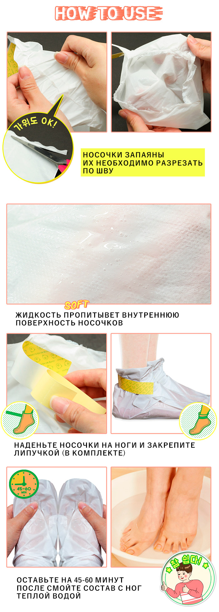 3.Наденьте пилинг-носочки,подержите 45-60 минут, чтобы пилинг полностью подействовал.