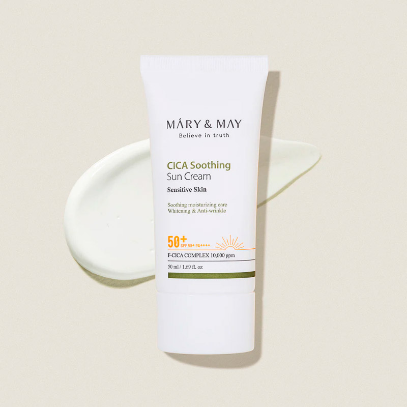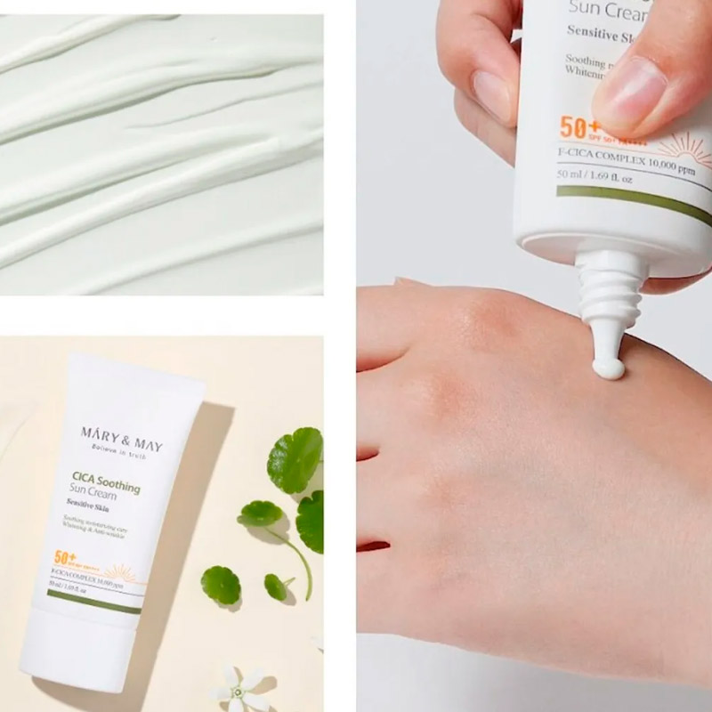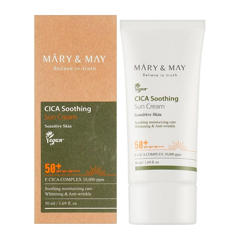 Успокаивающий солнцезащитный крем с центеллой Mary May CICA Soothing Sun Cream SPF50+ PA++++ обеспечивает защиту от UVA- и UVB-излучения, предотвращает повреждение кожи, ожоги и появление пигментации, успокаивает и смягчает, выравнивает тон, снимает раздражение и глубоко увлажняет.