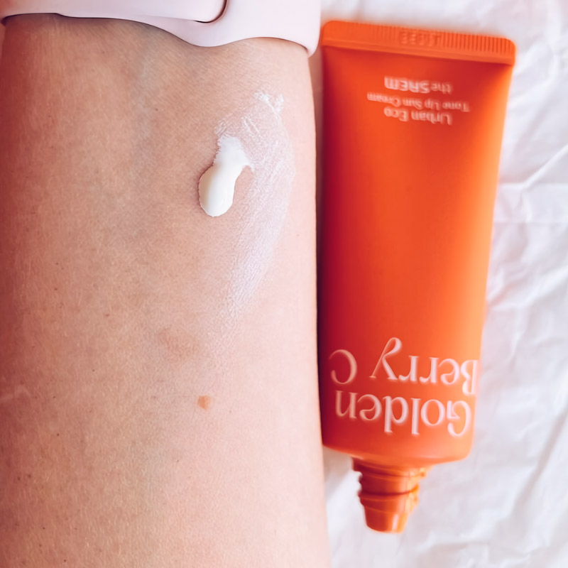 Осветляющий солнцезащитный крем The Saem Urban Eco Golden Berry C Tone Up Sun Cream SPF50+ PA++++ защищает от пагубного воздействия солнечных лучей, осветляет пигментацию и выравнивает тон кожи, хорошо увлажняет и напитывает полезными микроэлементами и витаминами, снимает зуд и покраснения, воспаления.