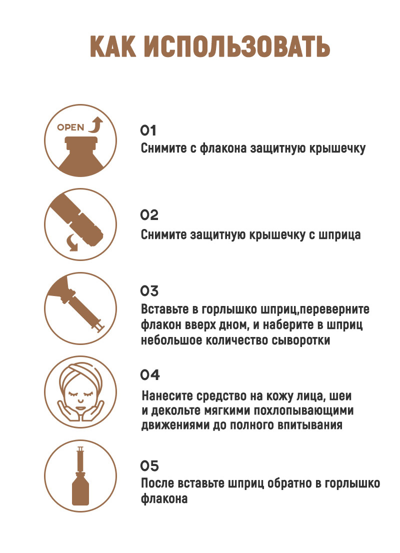 Снимите с флакона защитную крышечку, вставьте в горлышко шприц,переверните флакон вверх дном, и наберите в шприц небольшое количество сыворотки. Нанесите средство на кожу лица, шеи и декольте мягкими похлопывающими движениями до полного впитывания. После вставьте шприц обратно в горлышко флакона.