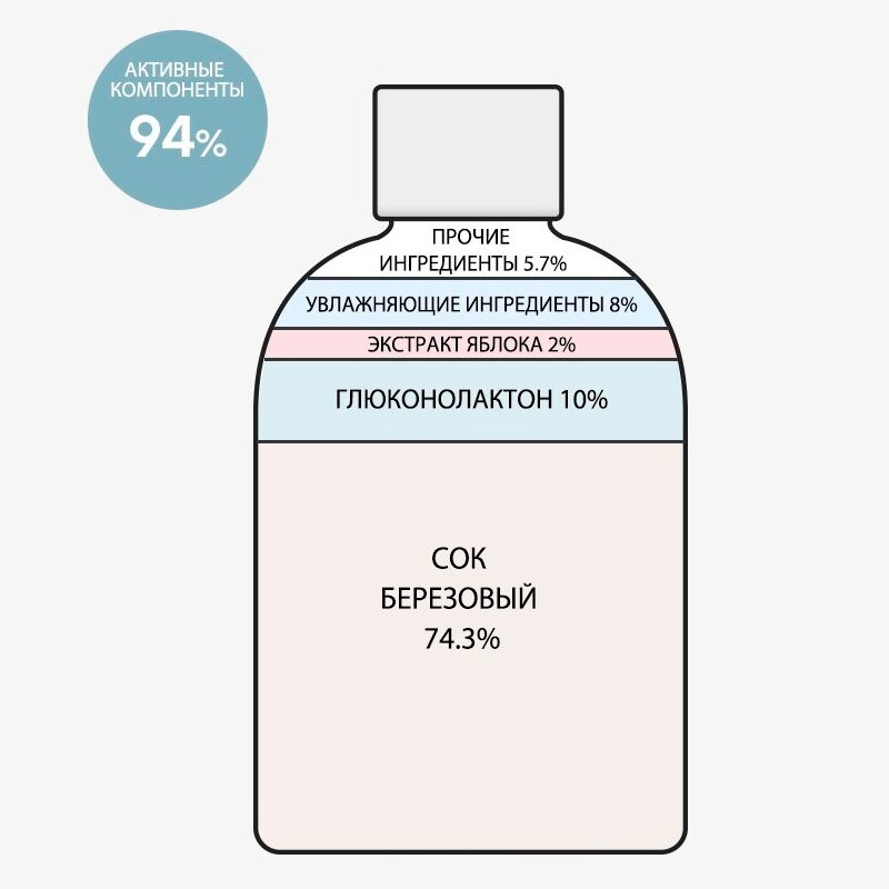 Birch Sap 74.3%, Gluconolactone 10%, Propanediol 5%, Butylene Glycol 3%, Tromethamine 3%, 1.2-Hexanediol 2.2%, Apple Extract 2%, Purified water, Ethylhexylglycerin, Hydroxyethylcellulose, Xanthan Gum, Disodium EDTA, Sodium Acetate, Cellulose