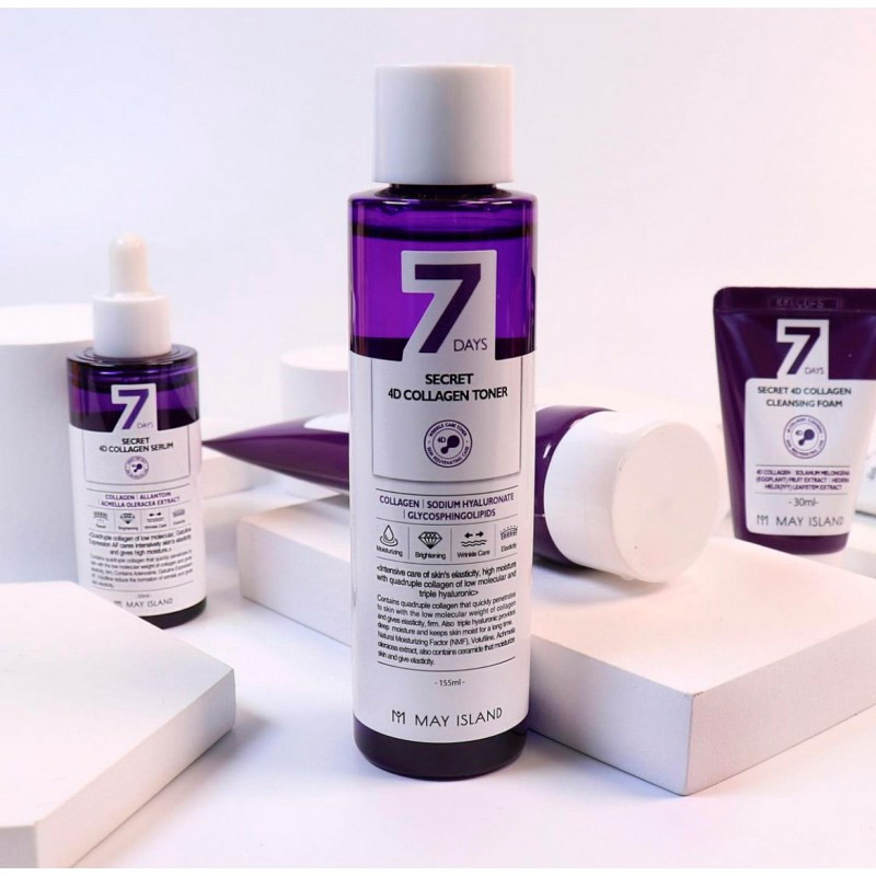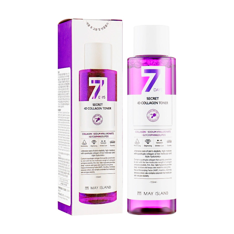 May Island 7 Days Secret 4D Collagen Toner Глубоко увлажняет и питает после очищения, повышает эластичность тканей, разглаживает морщины, улучшает цвет лица.