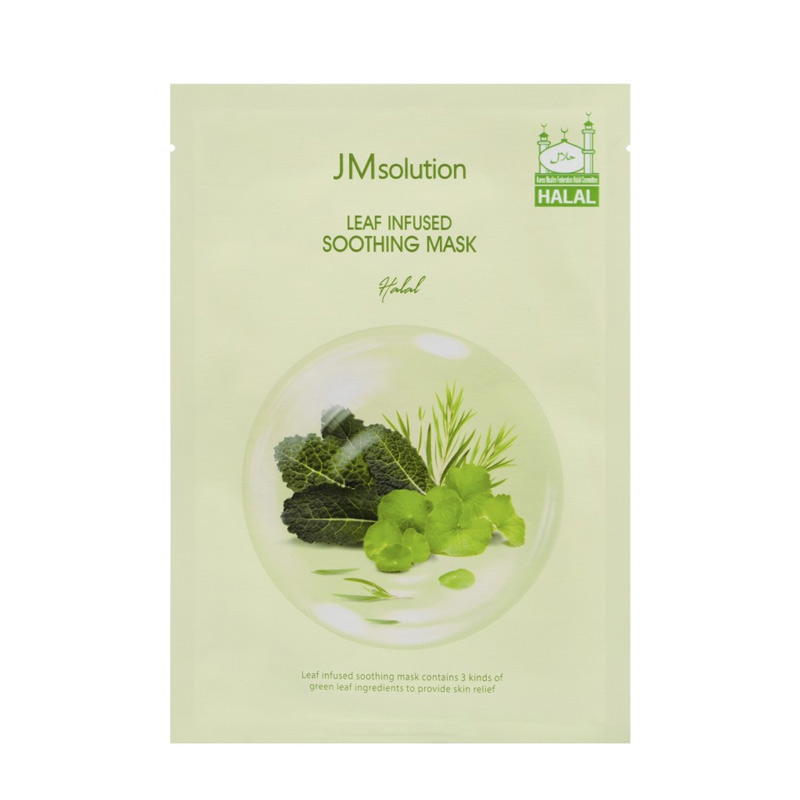 Успокаивающая маска на основе листьев растений JMsolution Leaf Infused Soothing Mask Halal восстанавливает упругость и эластичность тканей, успокаивает, увлажняет и замедляет процессы старения, эффективно борется с воспалением и раздражением, устраняет зуд и покраснения. Защищает от агрессивного воздействия внешних факторов и укрепляет естественный защитный барьер эпидермиса.